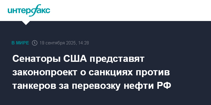 Москва. 19 сентября. INTERFAX.RU - Американские сенаторы намерены 19 сентября представить законопроект о значительном расширении санкций США против танкеров "теневого флота", занимающихся перевозкой российской нефти, сообщает The Financial Times.