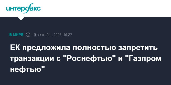 Москва. 19 сентября. INTERFAX.RU - Еврокомиссия в рамках 19-го пакета санкций против России предлагает полностью запретить транзакции с компаниями "Газпром нефть" и "Роснефть", сообщила в видеообращении председатель ЕК Урсула фон дер Ляйен.