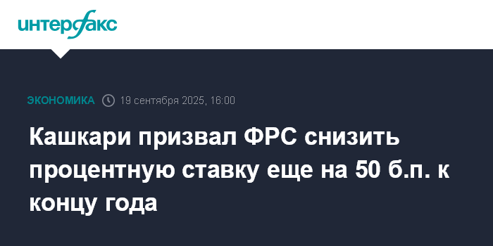 Москва. 19 сентября. INTERFAX.RU - Федеральной резервной системе США целесообразно снизить процентную ставку по федеральным кредитным средствам еще на 50 базисных пунктов до конца текущего года, чтобы поддержать рынок труда, считает президент Федерального резервного банка Миннеаполиса Нил Кашкари. Он написал об этом в заметке на сайте своего ФРБ.