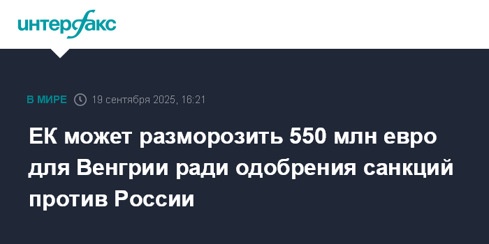 Москва. 19 сентября. INTERFAX.RU - Еврокомиссия намерена предоставить Венгрии 550 млн евро из замороженных фондов Евросоюза для Венгрии, чтобы в обмен на это Будапешт не применял право вето в отношении новых санкций против России, пишет The Financial Times.