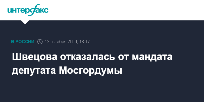 Москва. 12 октября. INTERFAX.RU - Первый заместитель мэра в правительстве столицы Людмила Швецова отказывается от мандата депутата Мосгордумы пятого созыва.