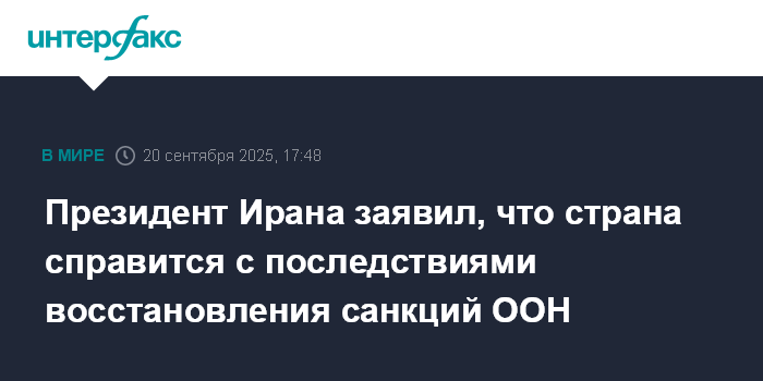 Москва. 20 сентября. INTERFAX.RU - Иранцы найдут способ продолжить развитие страны в случае восстановления санкций ООН, заявил в субботу президент Ирана Масуд Пезешкиан.