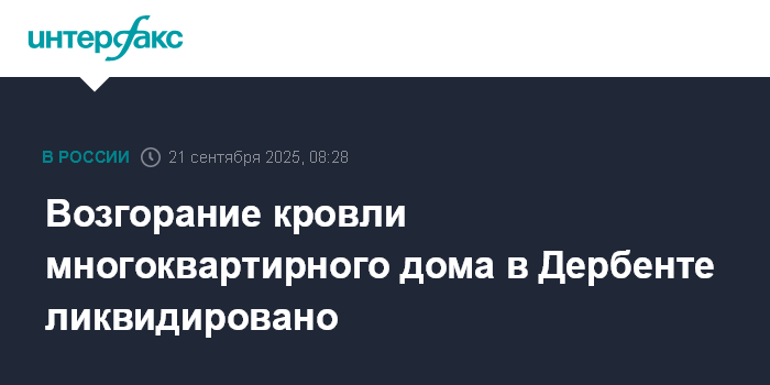Москва. 21 сентября. INTERFAX.RU - Пожарные полностью ликвидировали возгорание кровли девятиэтажного дома в дагестанском Дербенте, жертв и пострадавших нет, сообщает в воскресенье пресс-служба ГУ МЧС России по республике.