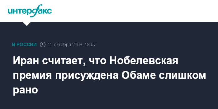 Тегеран. 12 октября. INTERFAX.RU - Нобелевская премия мира присуждена президенту США Бараку Обаме довольно неожиданно и слишком рано, заявил в понедельник на пресс-конференции представитель министерства иностранных дел Ирана Хасан Кашкави.