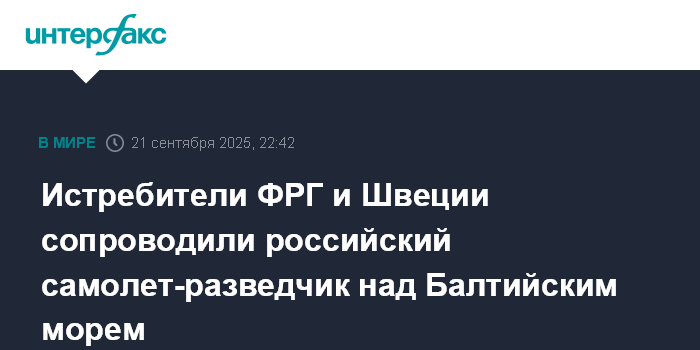 Москва. 21 сентября. INTERFAX.RU - Истребители ВВС Германии и Швеции поднимались в воздух для сопровождения российского разведывательного самолета над Балтийским морем, сообщает в воскресенье Associated Press со ссылкой на немецких и шведских военных.