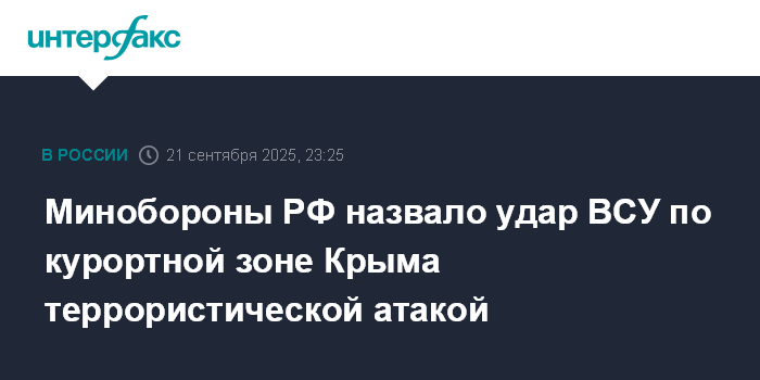 Москва. 21 сентября. INTERFAX.RU - В Минобороны России заявили, что расценивают украинский удар по курортной зоне Крыма как преднамеренную террористическую атаку.