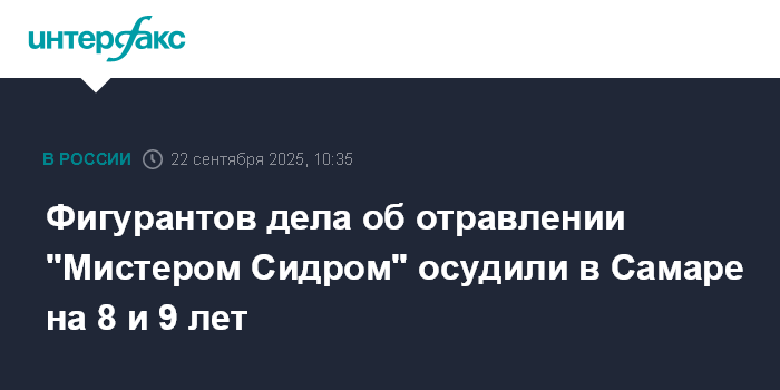 Москва. 22 сентября. INTERFAX.RU - Красноглинский районный суд Самары приговорил Анара Гусейнова и Артема Айрапетяна к 9 и 8 годам колонии общего режима соответственно по делу о массовом отравлении напитком "Мистер Сидр", в результате которого погибли 50 человек, передает корреспондент "Интерфакса" из зала суда.
