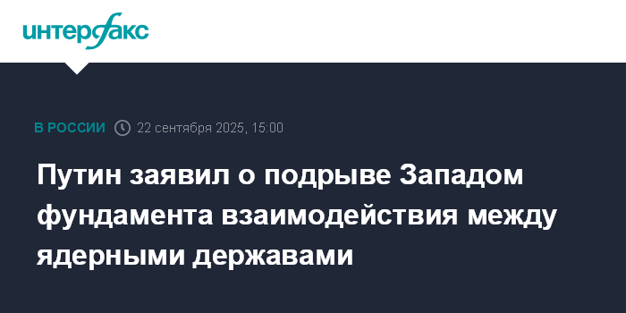 Москва. 22 сентября. INTERFAX.RU - Фундамент взаимодействия между ядерными державами был существенно подорван из-за разрушительных шагов Запада, заявил президент РФ Владимир Путин.