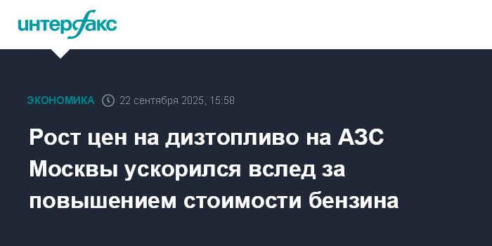 Москва. 22 сентября. INTERFAX.RU - Рост цен на дизтопливо на автозаправках Москвы ускорился к концу сентября вслед за повышением стоимости бензина, свидетельствуют данные сайта Московской топливной ассоциации (МТА).