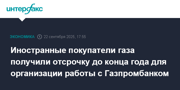 Москва. 22 сентября. INTERFAX.RU - Иностранные покупатели российского газа до конца 2025 года смогут расплачиваться за поставки через любой банк РФ, а не только Газпромбанк (который в ноябре 2024 года был включен в санкционный список США).