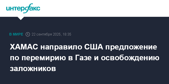 Москва. 22 сентября. INTERFAX.RU - Движение ХАМАС написало письмо президенту США Дональду Трампу с предложением по перемирию в секторе Газа и освобождению заложников, сообщает в понедельник телеканал Fox News со ссылкой на источники.