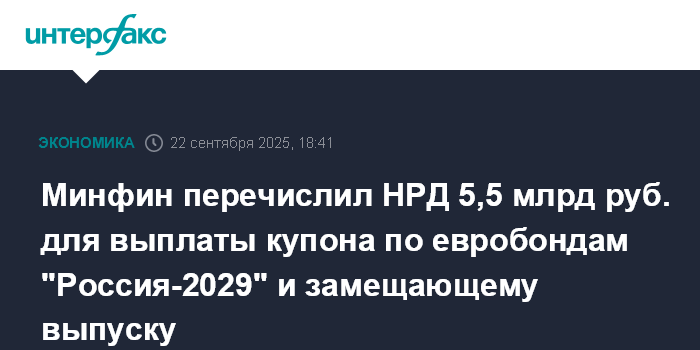 Москва. 22 сентября. INTERFAX.RU - Минфин РФ перечислил в Национальный расчетный депозитарий (НРД) 5,5 млрд рублей (эквивалент $65,6 млн) для выплаты купонного дохода по суверенным еврооблигациям со сроком погашения в 2029 году, а также по замещающему эти евробонды выпуску, следует из сообщения министерства.