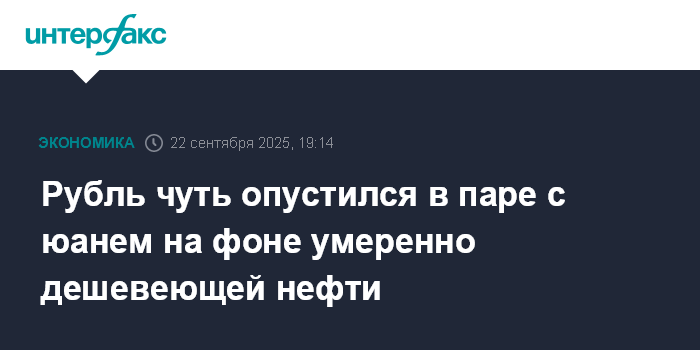 Москва. 22 сентября. INTERFAX.RU - Китайский юань немного подрос на Московской бирже по итогам торгов в понедельник, рубль опустился на фоне дешевеющей нефти и санкционных новостей. На прошлой неделе Еврокомиссия утвердила 19-й пакет санкций ЕС в отношении России, включающий ограничения в отношении российских банков и нефти.