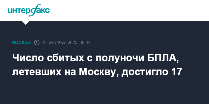 Москва. 23 сентября. INTERFAX.RU - С начала вторника на подлете к Москве было нейтрализовано уже 17 беспилотников, следует из сообщений мэра столицы Сергея Собянина.
