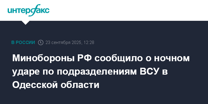 Москва. 23 сентября. INTERFAX.RU - Вооружённые силы России ночью нанесли групповой удар по подразделениям ВСУ в Одесской области в ответ на атаку на гражданские объекты в Крыму, сообщило министерство обороны РФ во вторник.