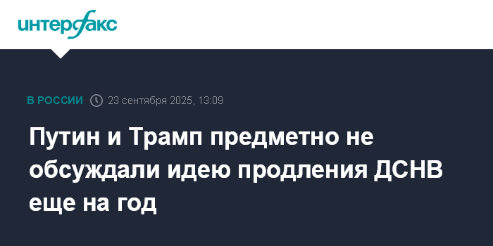 Москва. 23 сентября. INTERFAX.RU - Президенты РФ и США Владимир Путин и Дональд Трамп не обсуждали предметно возможность продления Договора о дальнейшем сокращении стратегических наступательных вооружений (ДСНВ), заявил пресс-секретарь главы российского государства Дмитрий Песков.