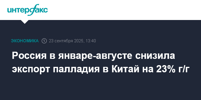 Москва. 23 сентября. INTERFAX.RU - Россия в январе-августе 2025 года снизила на 23% в годовом исчислении экспорт палладия в Китай, до $424,1 млн, говорится в материалах Главного таможенного управления КНР.