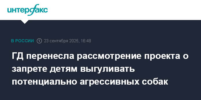 Москва. 23 сентября. INTERFAX.RU - Законопроект, запрещающий выгул собак потенциально агрессивных пород детьми до 16 лет и лицами в состоянии наркотического или алкогольного опьянения, не вошел в число рассмотренных во вторник на пленарном заседании Думы.