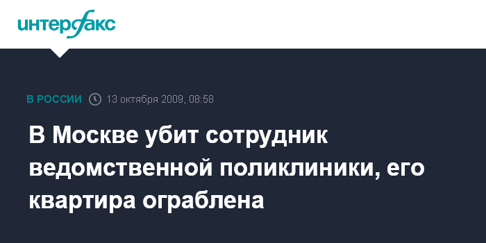 Москва. 13 октября. INTERFAX.RU - В Москве на Рублевском шоссе в своей квартире найден убитым сотрудник ведомственной поликлиники крупной компании, из квартиры похищены деньги и ценности, сообщил "Интерфаксу" во вторник источник в правоохранительных органах.