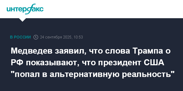 Москва. 24 сентября. INTERFAX.RU - Замглавы Совбеза РФ Дмитрий Медведев выразил мнение, что президент США Дональд Трамп в данный момент попал в альтернативную реальность, а также уверенность, что через пару дней он вернется к реальному положению дел.