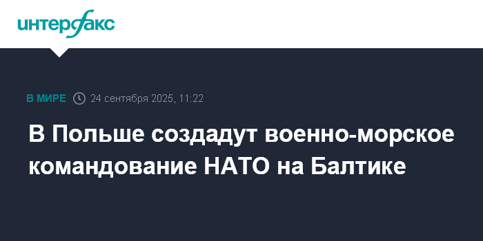 Москва. 24 сентября. INTERFAX.RU - Польша приступила к созданию регионального военно-морского командования НАТО, сообщилапресс-служба Генерального штаба польских вооруженных сил.