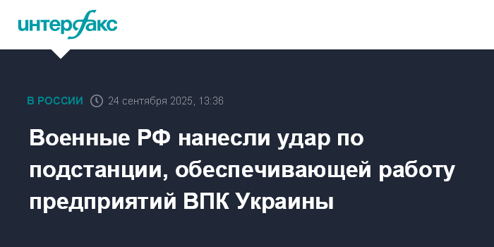 Москва. 24 сентября. INTERFAX.RU - Российские военные сообщили, что нанесен удар по электроподстанции, обеспечивающей работу предприятий военно-промышленного комплекса Украины и производственным цехам предприятия "Мотор Сич".