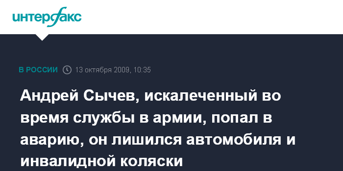 Москва. 13 октября. INTERFAX.RU – Андрей Сычев, который лишился обеих ног после издевательств старослужащих во время срочной службы в армии, в выходные попал в ДТП. Машина, за рулем которой он находился, и коляска разбиты, человеческих жертв нет.