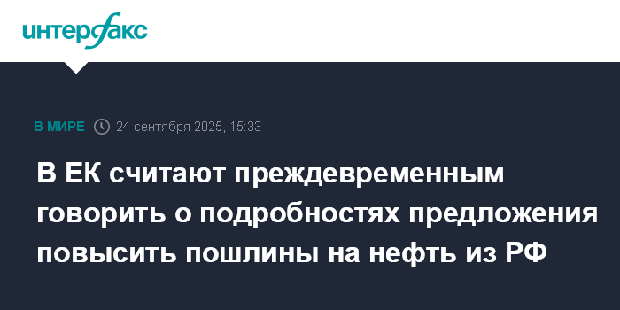 Москва. 24 сентября. INTERFAX.RU - Заявление главы Еврокомиссии (ЕК) Урсулы фон дер Ляйен о планах повысить таможенные пошлины на российскую нефть пока рано комментировать в подробностях, заявил официальный представитель ЕК Олоф Жилл.