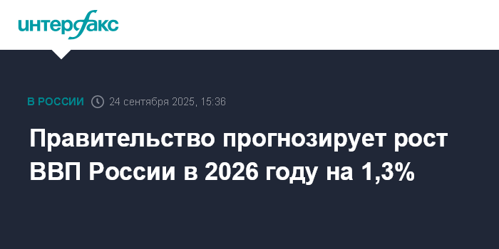 Москва. 24 сентября. INTERFAX.RU - Прогноз социально-экономического развития на 2025-2028 годы, который рассматривает правительство, предусматривает рост российской экономики в 2026 году на 1,3%, сообщил премьер-министр Михаил Мишустин.