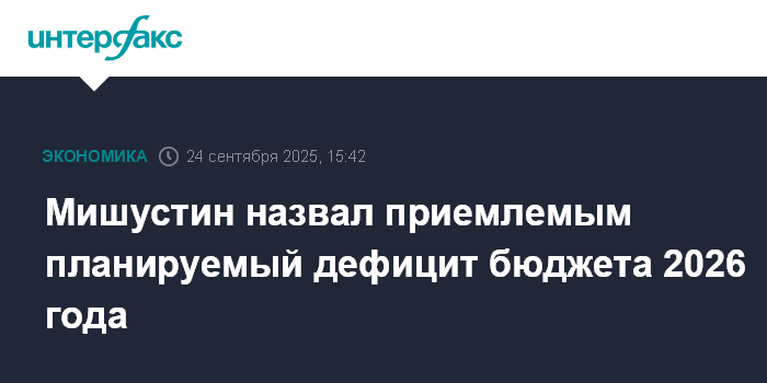 Москва. 24 сентября. INTERFAX.RU - Дефицит федерального бюджета РФ в 2026 году будет находиться на приемлемом уровне, сообщил на заседании правительства премьер-министр Михаил Мишустин.