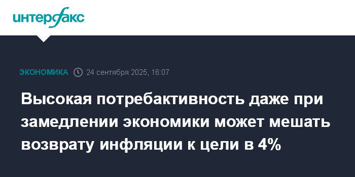Москва. 24 сентября. INTERFAX.RU - Сохранение высокой потребительской активности даже при замедлении темпов роста экономики может мешать возвращению инфляции к цели в 4%, говорится в резюме обсуждения ключевой ставки ЦБ РФ по итогам сентябрьского заседания совета директоров.