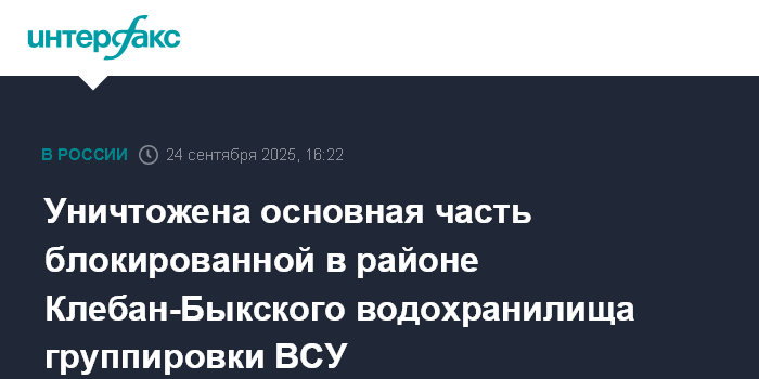 Москва. 24 сентября. INTERFAX.RU - Уничтожена основная часть блокированной в районе Клебан-Быкского водохранилища группировки вооруженных сил Украины, после её разгрома российские войска продолжают вести активные действия, заявили в Минобороны РФ в среду.