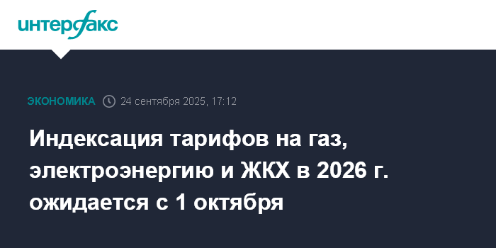 Индексация тарифов на газ, электроэнергию и ЖКХ в 2026 г. ожидается с 1 октября