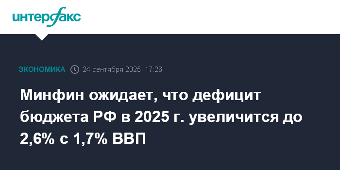 Минфин ожидает, что дефицит бюджета РФ в 2025 г. увеличится до 2,6% с 1,7% ВВП