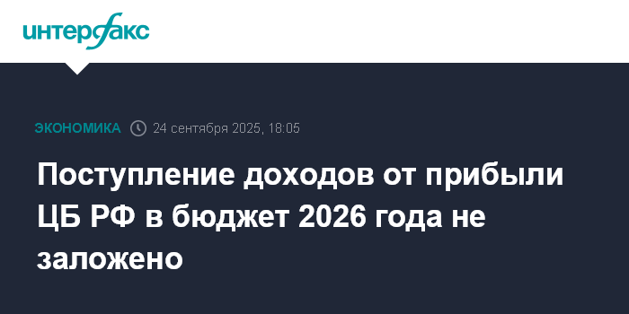 Москва. 24 сентября. INTERFAX.RU - Поступление доходов от прибыли ЦБ РФ не заложено в федеральный бюджет на 2026 год, говорится в пояснительной записке к проекту бюджета на 2026-2028 годы, с которой ознакомился источник "Интерфакса".