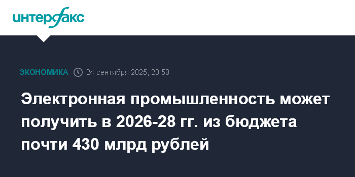 Москва. 24 сентября. INTERFAX.RU - Госпрограмма "Развитие электронной и радиоэлектронной промышленности" в 2026-2028 годах может быть профинансирована из федерального бюджета на сумму более 428 млрд рублей. Об этом сообщил "Интерфаксу" источник, знакомый с пояснительной запиской к проекту бюджета на 2026 год, плановый период 2027-2028 гг.