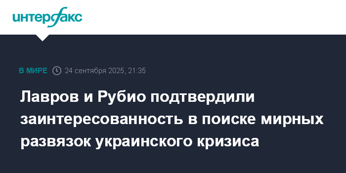 Москва. 24 сентября. INTERFAX.RU - Министр иностранных дел России Сергей Лавров и государственный секретарь США Марко Рубио в ходе встречи "на полях" недели высокого уровня 80-й сессии Генассамблеи ООН подтвердили взаимную заинтересованность в поиске мирных развязок конфликта на Украине, сообщает МИД РФ.
