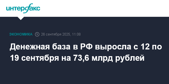 Денежная база в РФ выросла с 12 по 19 сентября на 73,6 млрд рублей