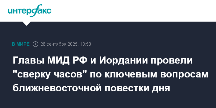Москва. 26 сентября. INTERFAX.RU - Министры иностранных дел России и Иордании Сергей Лавров и Айман Сафади на встрече в Нью-Йорке "на полях" 80-й сессии Генассамблеи ООН провели обстоятельную "сверку часов" по ключевым вопросам ближневосточной повестки дня, сообщил МИД РФ.