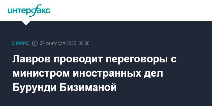 Москва. 27 сентября. INTERFAX.RU - Глава МИД РФ Сергей Лавров проводит переговоры с министром иностранных дел, региональной интеграции и сотрудничества в целях развития Бурунди Эдуардом Бизиманой на полях недели высокого уровня 80-й сессии Генассамблеи ООН.