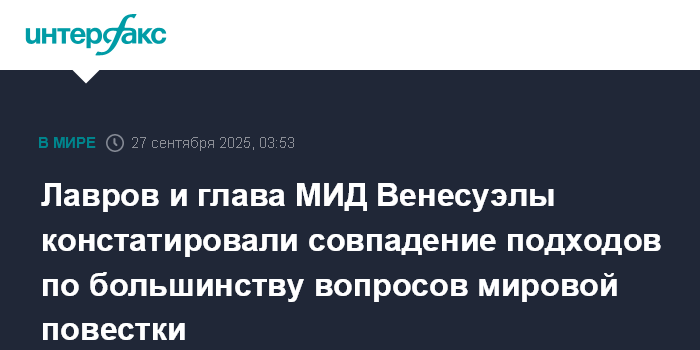 Москва. 27 сентября. INTERFAX.RU - Глава МИД РФ Сергей Лавров и министр иностранных дел Боливарианской Республики Венесуэла Иван Хиль Пинто во время беседы в Нью-Йорке "на полях" 80-й сессии Генеральной Ассамблеи ООН констатировали совпадение подходов двух стран по большинству вопросов актуальной мировой повестки.