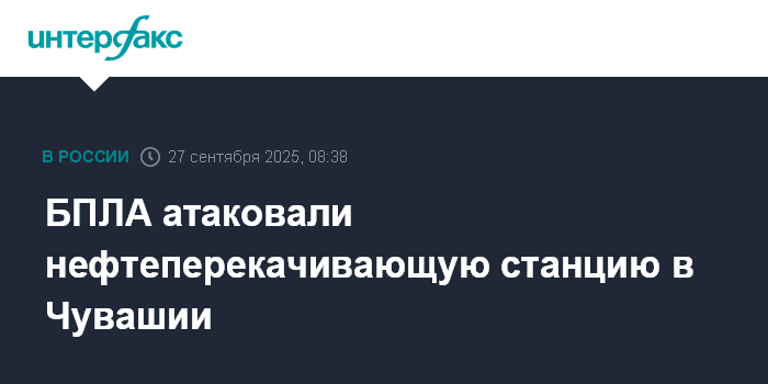 Москва. 27 сентября. INTERFAX.RU - Удар нанесён по нефтеперекачивающей станции в Чувашии, сообщил глава республики Олег Николаев.