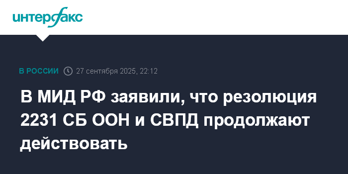 Москва. 27 сентября. INTERFAX.RU - Резолюция 2231 Совбеза ООН и Совместный всеобъемлющий план действий по урегулированию вокруг иранской ядерной программы (СВПД) продолжают действовать, заявили в МИД РФ.