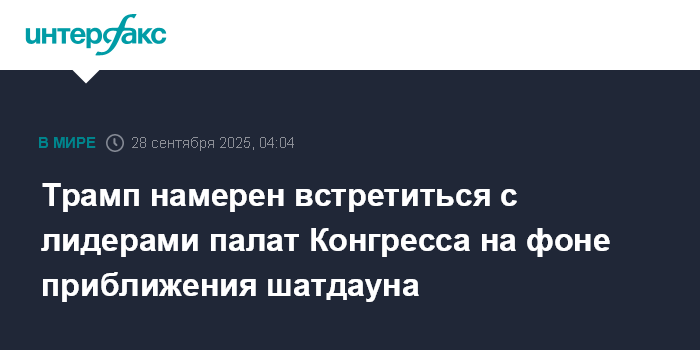 Москва. 28 сентября. INTERFAX.RU - Президент США Дональд Трамп в понедельник в условиях приближающегося шатдауна - остановки работы правительства - планирует встретиться с лидерами республиканцев и демократов в Палате представителей и Сенате, сообщил телеканал NBC News со ссылкой на источники в Белом доме и Конгрессе.