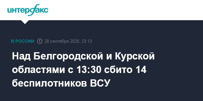 Москва. 28 сентября. INTERFAX.RU - Российские военные уничтожили с 13:30 до 23:00 воскресенья 14 украинских беспилотников над Белгородской и Курской областями, сообщили в Минобороны РФ в воскресенье.