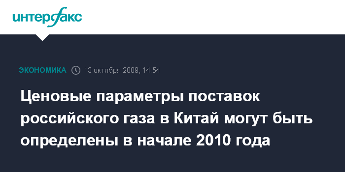 Москва. 13 октября. INTERFAX.RU – Ценовые параметры поставок российского газа в Китай могут быть определены в начале 2010 г., заявил журналистам вице-премьер правительства РФ Игорь Сечин.