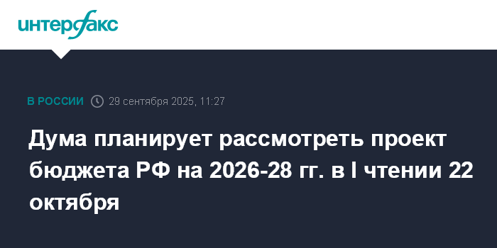 Дума планирует рассмотреть проект бюджета РФ на 2026-28 гг. в I чтении 22 октября