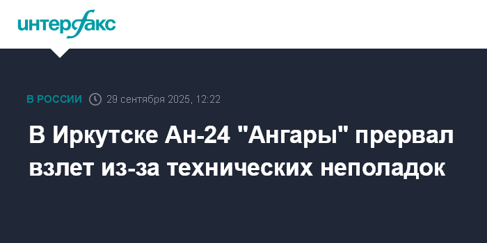 "29 сентября 2025 года, в 10 часов 18 минут (местного времени, 05:18 по Москве), в аэропорту города Иркутска произошло авиационное событие. Взлет воздушного судна Ан-24 авиакомпании "Ангара", выполняющего рейс по маршруту "Иркутск-Бодайбо", был прерван по решению командира воздушного судна в связи с техническими неполадками", - говорится в сообщении.