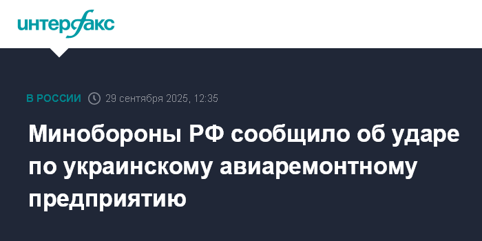 Москва. 29 сентября. INTERFAX.RU - Российские военные нанесли удар по украинскому ремонтному предприятию авиационной промышленности, сообщили в Минобороны РФ в понедельник.