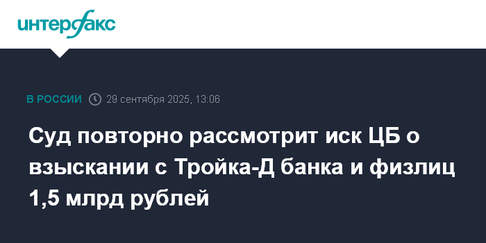 Суд повторно рассмотрит иск ЦБ о взыскании с Тройка-Д банка и физлиц 1,5 млрд рублей